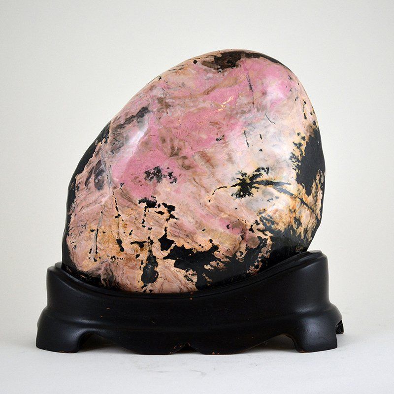 This beautiful Long River (Yangtze) cobble has been naturally worn smooth in the waters of the largest river in China. The fascinating layered pattern are reminiscent of ocean waves in a storm. Or, these may be endless waves in space or in one’s mind. Regardless, it is a stone that evokes feelings from viewers. This stone is 21 cm high, 17 cm wide and 6 cm deep; while the hand carved wood base with a water and fish motif is 10.8 cm high at its highest point, 17.5 cm wide and 9.5 cm deep at the bottom. It is in the collection of Tom Elias & Hiromi Nakaoji.