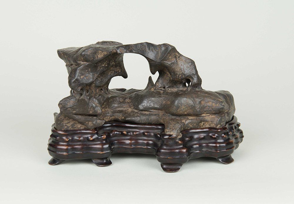 The whitish patterns in this dark limestone are actually cross sections of fossil segments of ancient crinoid stems. These segmented stalked marine animals were once more abundant in shallow ocean environments than they are today. The segments are composed primarily of calcium carbonate. The Japanese suiseki community included fossils in their suite of stones that were collected and appreciated, although this was not a common practice.