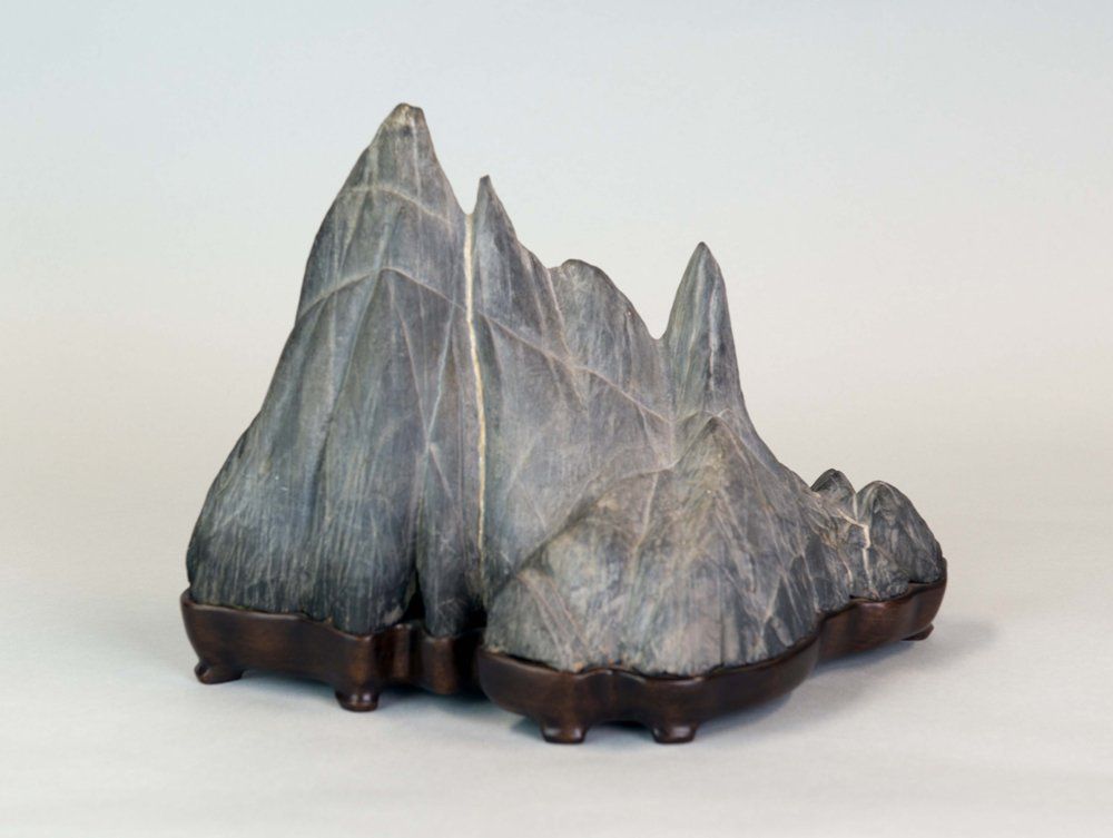 The contrast between the black background and the white fossils create a dramatic scene. This type of pattern stone has long been appreciated in suiseki history. Two of these stones are included in the valuable Japanese reference “Densho-seki or Historical Stones.”