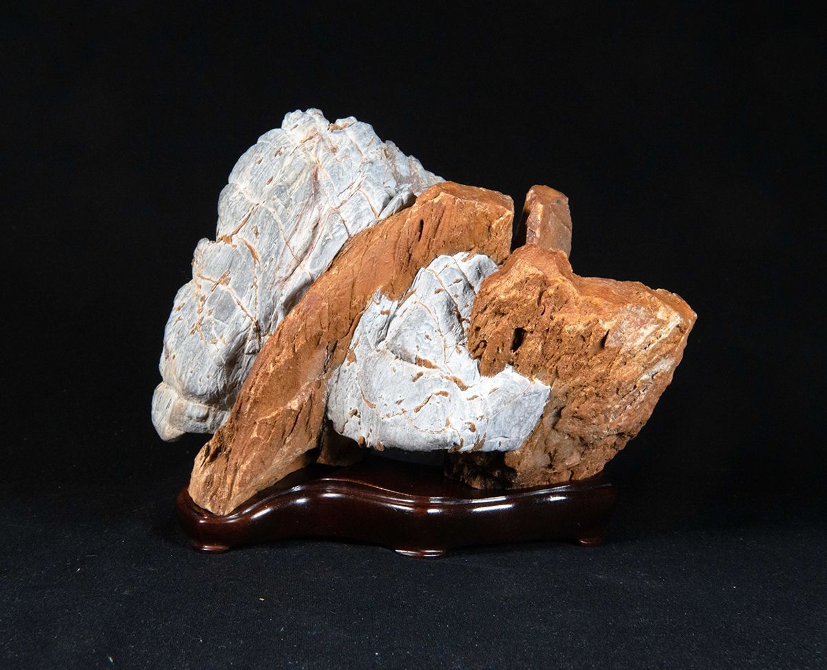The layers and layers of weather stone and its colors are analogous to the tree rings seen in an old tree, which gives the stone an ancient appearance. The imperfections on the surface contribute to a feeling of the Wabi aesthetic. I like stones that are not always like a distance mountain, plateau, or other commonly seen landscape forms. A pot can be an element of the man-made landscape, similar to a boat or hut.