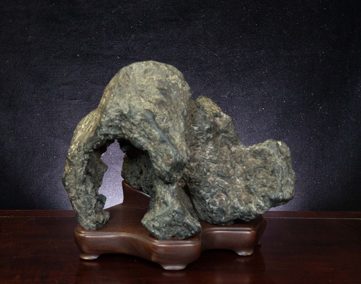 Senshu Pot stones (Tsubo-ishi) are round or nearly round concretions with a hole suggesting a thick-walled pot. They are found in the Wakayama mountain range overlooking the Osaka Plain. When they are dug from the earth, they are covered with red soil that must be removed with a wire brush. The better-quality ball-shaped stones have an empty hole in the center. According to Matsuura Arishige, Senshu pot stones are very rare. Senshu is an older name for Osaka. This stone was gifted to us in 2005 by the daughter of Kari ike-an (artist name).