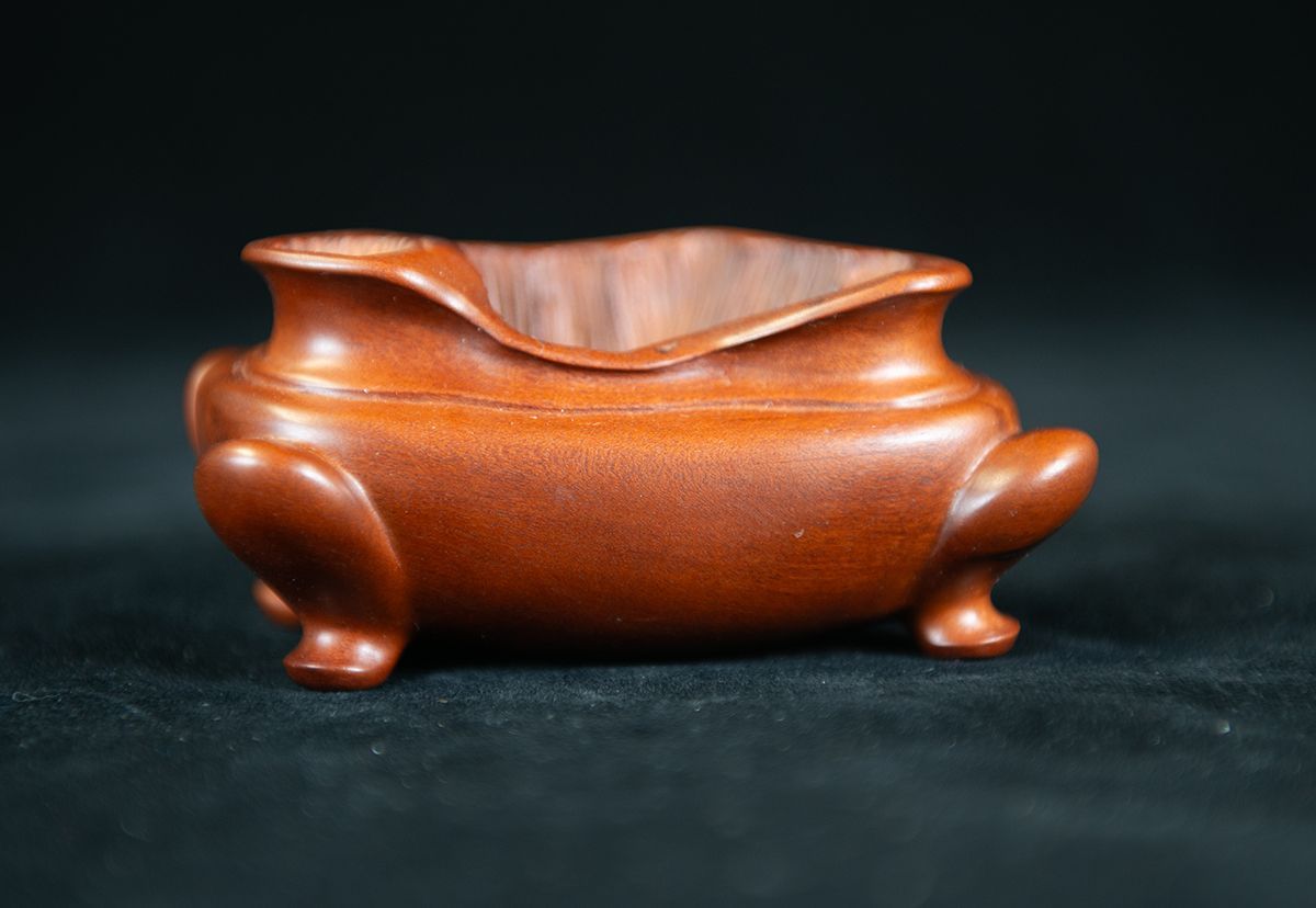 Preferred Wood: He often uses jujube wood (Ziziphus jujuba) because it is hard, durable, and fine grained. It has a beautiful reddish color when polished as illustrated here. Lee treats his finished bases with a light coat of Vasoline petroleum jelly, a blend of oils and waxes. Lee also uses Zelkova (Zelkova serrata), Ebony (Diospryos), and Walnut (Juglans) wood..