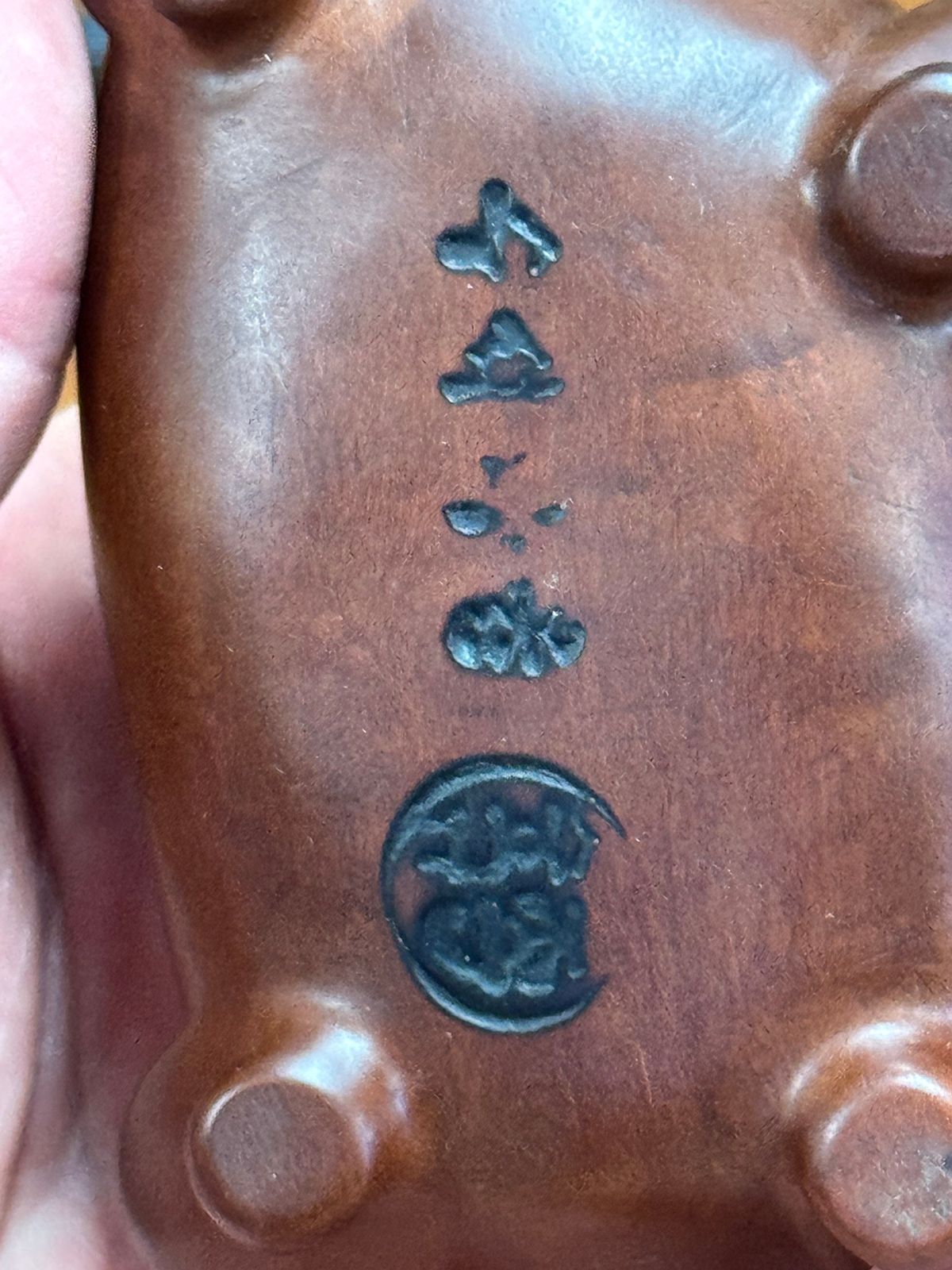 Signature: Smith has used several variations of his mark over his career as a base carver. The earliest ones consisted of a large seal with his given name, but the signature became smaller and consisted only of two Japanese characters over time.
