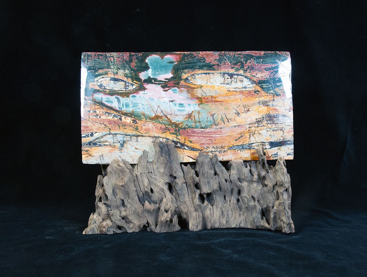 These brightly colored stones originate in western Guangdong Province where they are mined, shaped and polished to bring out the vivid colors. They are a metamorphic stone containing many different elements that are responsible for the hues and patterns. This is an ancient stone dating back roughly 600 million years. Ruyuan color stones are relatively new to the viewing stone markets and are found mainly in this southeastern province.