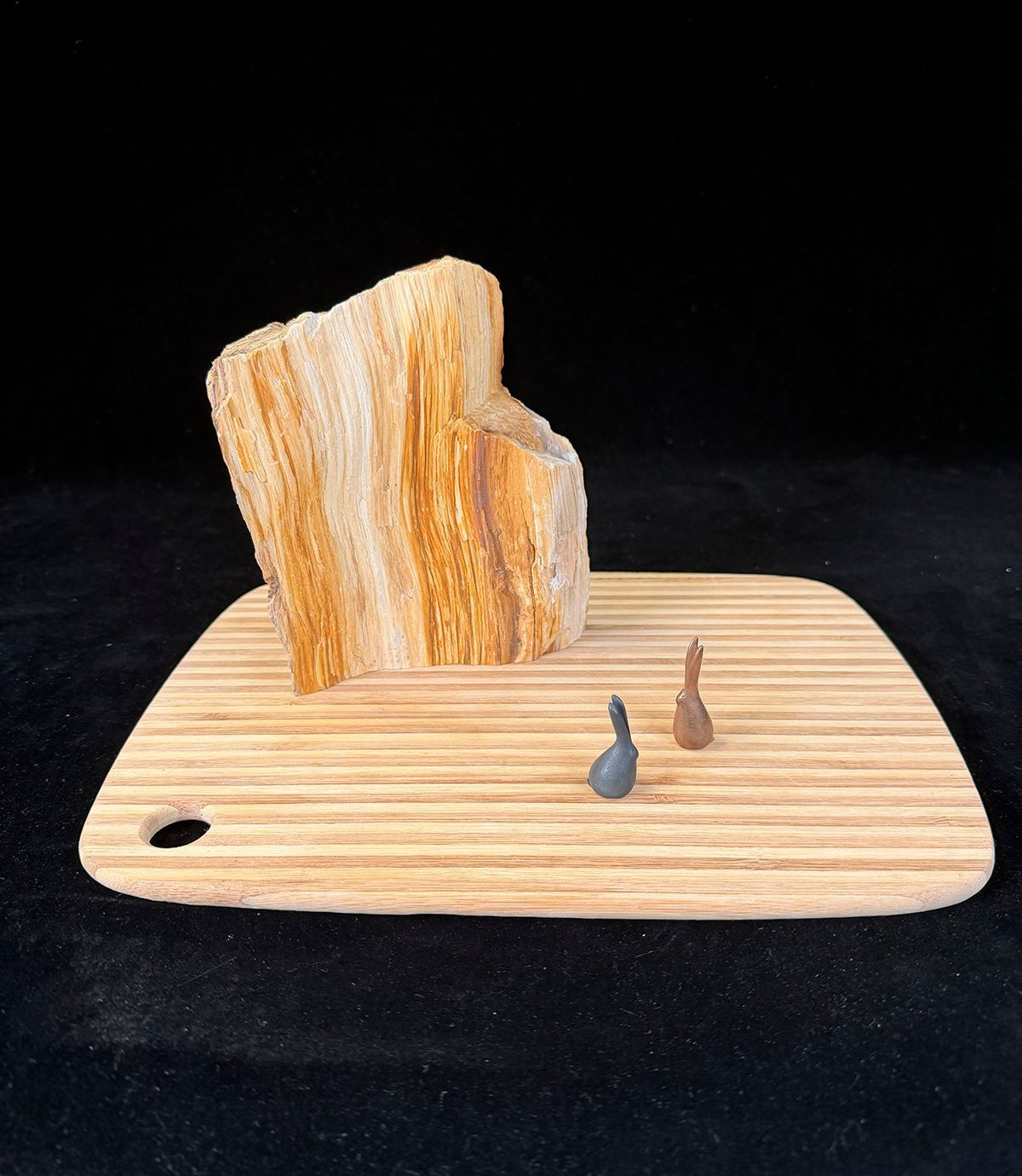 Two rabbits viewing a monolith is our contemporary display of the month. The two modern-style Japanese bronze tenpai are appropriate for this wood cutting board and piece of fossil wood from the desert region of the southwestern United States.