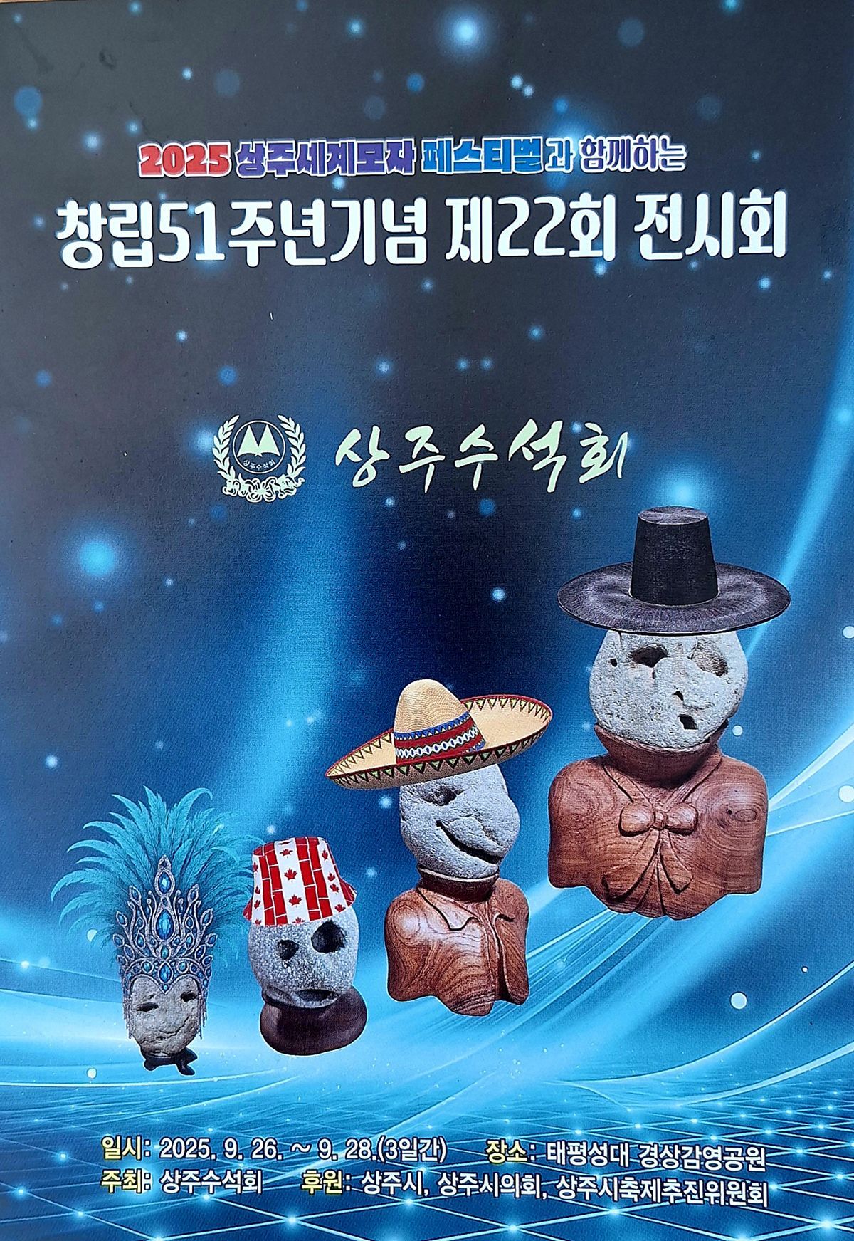 The Sangju Suseok Association celebrated its 51st anniversary this year by staging a Suseok exhibition as part of the Sangju International Hat Festival held in Gyeongsang National Park September 26 to 28, 2025. Twenty-three members of the association participated in this themed exhibition “Meeting the Hat and the Suseok.”