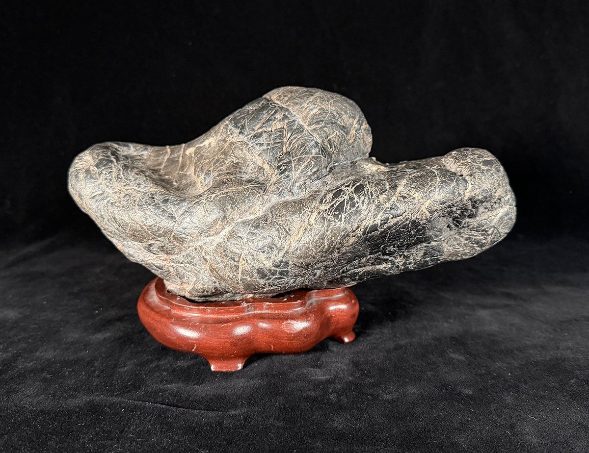 The form of this stone suggests movement or energy as it progresses on its journey. Where it has been and where it is going remain a mystery. In this orientation, it can suggest many options, including a boat or a canoe with the paddler hunched over as it surges forward.