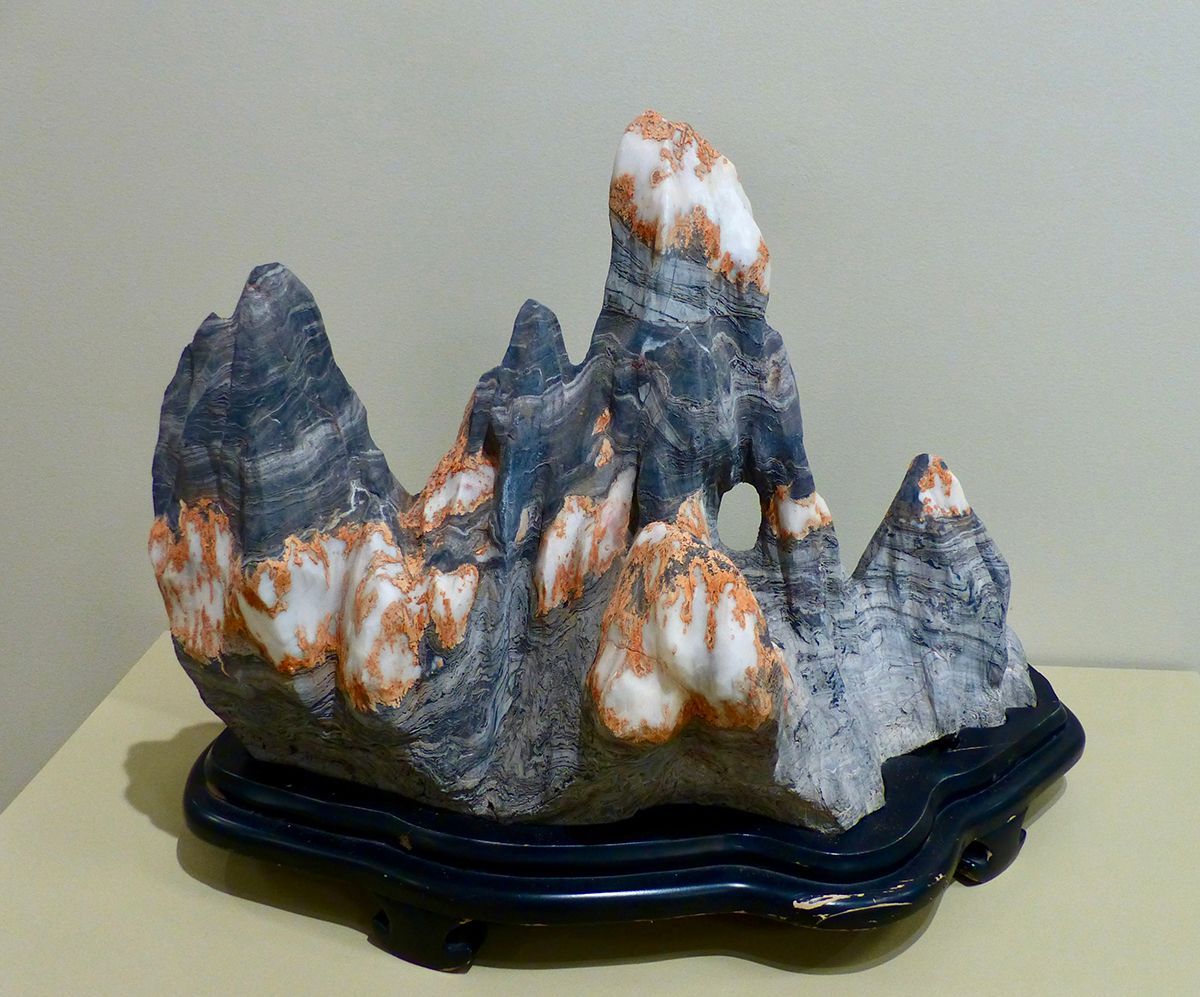 This large Chinese White Lingbi Stone, with the gray limestone rock contrasting sharply with the whitish siliceous or calcareous-siliceous formations, is a rare variant of the more common, uniformly dark-colored Lingbi Stone. The name of the stone, which embodies the orogenic forces that form mountains, is derived from a Daoist text that states "rising and falling, soaring upward or sitting down, the mountain brings about the great respiration of the world." This provocative specimen is currently on display in the Stone and Scene exhibition at the Hilbert Museum of California Art in Orange, California. Various viewing stones are paired with one or more California landscape scenes in a groundbreaking exhibition that helps raise the status of naturally occurring stone as objects of art. Stone and Scene will be at the Hilbert Museum from February 12 to October 1, 2026. This stone is in the private collection of Paul A. Harris.
